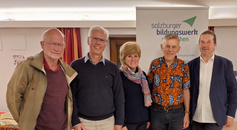 Im Bild v.l.n.r.: Siegfried Dietz (Unterstützer der Materialtransporte), Michael Tornow (Kassier Verein Gambia Sponsoring), Christine Pongruber (Katholisches Bildungswerk), Toni Wintersteller (Gründer und Obmann Verein Gambia Sponsoring), Hans Holzinger (Salzburger Bildungswerk Seekirchen)
