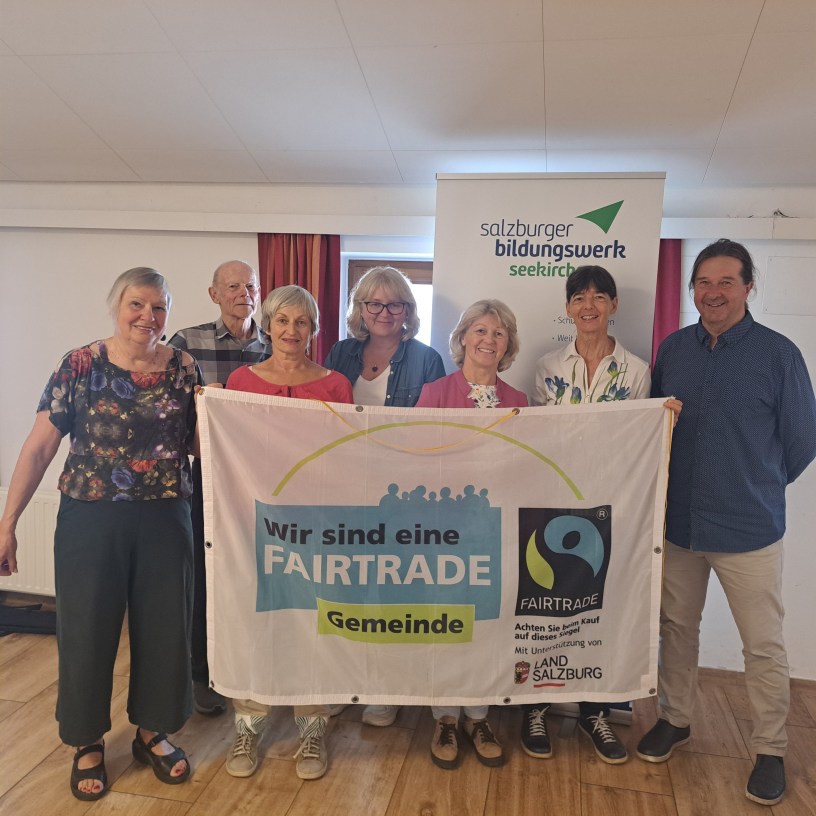 Die Fairtrade-Gruppe Seekirchen mit Koordinatorin Susanne Nobis (links), Hermann Handlechner, Linde Lipenski, Adrie Danner (Referentin Bildmitte), Maria Günther und Brigitte Mair sowie Hans Holzinger (Bildungswerkleiter)