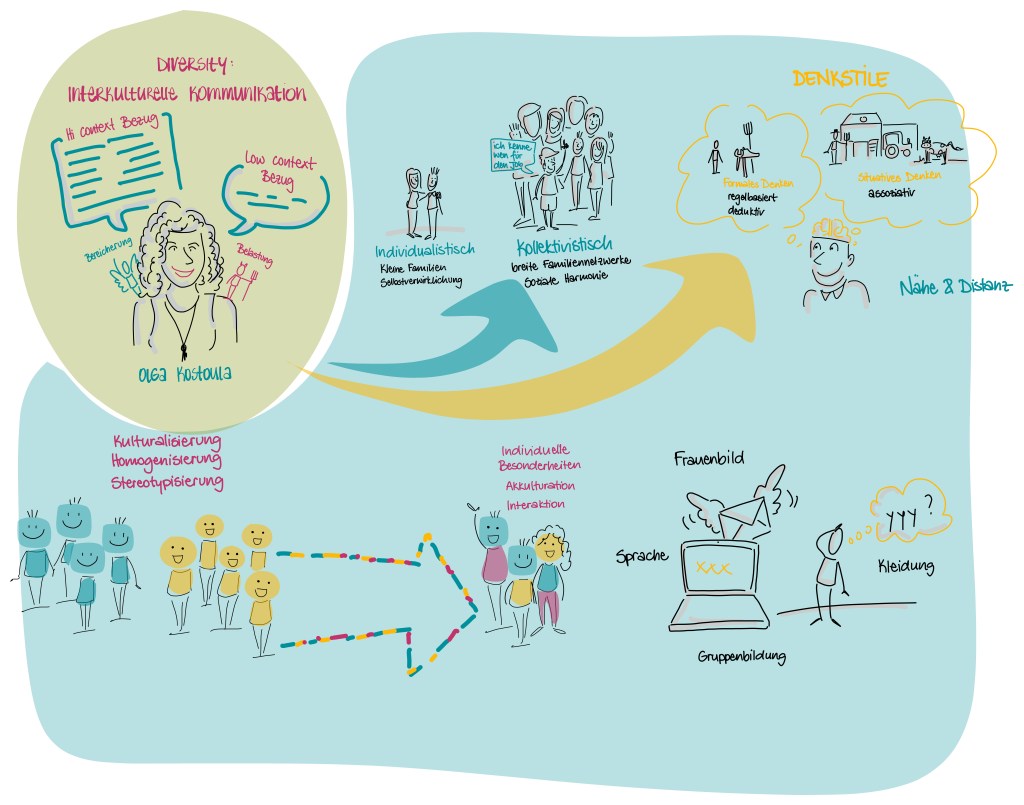 Körpersprache und physische Distanz können variieren und zu Mißverständnissen führen. Unterschiede könne es auch in den Denkstilen geben: situatives Denken sei stark assoziativ geprägt, formales Denken regelbasiert. Kostoulas Resümee: Diversity werde zwar als Unternehmensziel vielfach gehypt, aber es gäbe auch Probleme. So bilden sich in vielen Unternehmen Gruppen nach Sprachzugehörigkeit, andererseits gelte in vielen Unternehmen Business-Engilsh mittlerweile als Standard. Und man müsse auch vorsichtig sein im Zusammenhang mit Stereotypisierung und Kulturalisierung. Doch auch wenn sich eine Art Global Culture herausbildet, mache es Sinn, sich Wissen über andere Kulturen anzueignen, unterschiedliche Lebenswelten zu reflektieren und über Unterschiede zu sprechen.