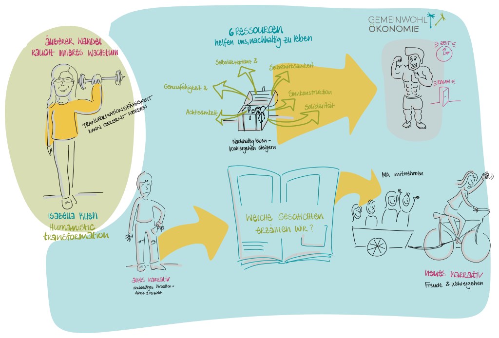 Isabelle Klien, Organisationsentwicklerin bei Humanistic Transformations, schloss in ihrem Input „Äußerer Wandel braucht inneres Wachstum“ gut an Mahlodji an. In Anlehnung an den Nachhaltigkeitspsychologen Marcel Hunecke beschrieb sie sechs Ressourcen, die das persönliche Wohlbefinden steigern und gleichzeitig eine suffiziente Lebens- und Wirtschaftsweise fördern. Genussfähigkeit bedeute, sich an den Dingen und der Welt zu erfreuen ohne permanente Steigerung („Weniger ist mehr“). Dazu passt die zweite Ressource Achtsamkeit „als Fähigkeit, meine Aufmerksamkeit auf den jetzigen Moment zu richten ohne zu bewerten“. Dies ermögliche, materialistische Ansprüche zu reduzieren und sozial und nachhaltiger zu leben. Als Ressourcen 3 und 4 gelten Selbstakzeptanz und Selbstwirksamkeit, das heißt, sich mit seinen Stärken und Schwächen anzunehmen und sich zuzutrauen, die eigenen Ziele zu erreichen. Für die Gemeinwohlökonomie bedeute dies, mit seinem Tun „einen kleinen Beitrag zur Veränderung leisten zu können.“ Sinnkonstruktion und Solidarität sind die weiteren Ressourcen. „Mit sinnvollem Wirtschaften leisten wir einen Beitrag zu mehr Nachhaltigkeit“, so Klien. Und die großen Themen wie die Klimakrise oder die Ungleichheit könnten nur gemeinsam angegangen werden, was Solidarität brauche. Die sechs Ressourcen verstärken sich gegenseitig und erzeugen eine in Gang gesetzte Aufwärtsspirale, dem alten Narrativ, dass Nachhaltigkeit nur mit Verzicht erreicht werden könne, folge das neue Narrativ von Freude und Wohlergehen durch ein nachhaltiges Verhalten, betonte die Unternehmensberaterin, die auch GWÖ-Unternehmen betreut. Als Nutzen für Unternehmen nannte sie die Transformation von innen heraus durch zufriedene Mitarbeiter und Mitarbeiterinnen.