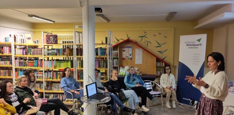 Bis auf einen Vater waren nur Mütter anwesend – die Väter waren wohl bei den Kleinen zu Hause! Diese wurden aber mit einem lebendigen und praxisnahen Vortrag belohnt. Man spürte, dass die Referentin authentisch hinter ihren Vorschlägen steht und dass sie viel Liebe zu Kindern hat. Bücher von Jesper Juul gibt es übrigens in der Bibliothek Seekirchen zum Ausleihen!