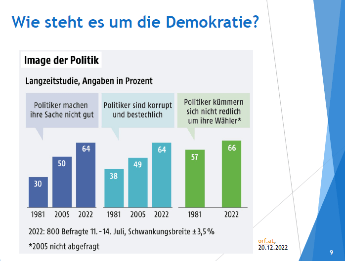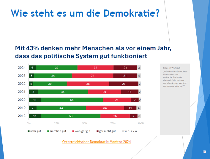 Dr. Franz Fallend, Politikwissenschaftler an der Universität Salzburg, referierte in seinem Vortrag Befunde zum Stand der Demokratie in Österrech sowie weltweit und er gab Empfehlungen, wie diese erneuert werden könne. Der Anteil der Menschen in Österreich, die das Imgae der Politik negativ bewerten, hat sich laut einer Umfrage aus 2022 in den letzten vierzig Jahren beinahe verdoppelt. Laut Demokratiemonitor hätten 2024 nur 43 Prozent der Menschen angeben, dass die Demokratie in Österreich gut oder sehr gut funktioniere, das sei zwar ein geringer Anstieg gegenüber dem Vorjahr, aber dennoch bedenklich, so der Politikwissenschaftler (siehe Grafiken).