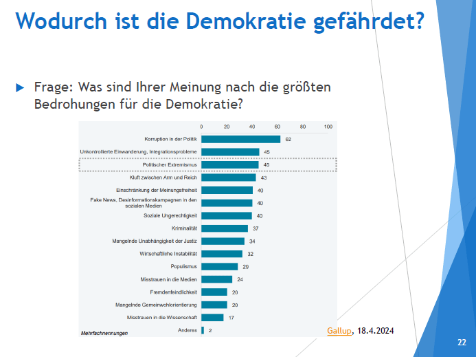 Blutvergießen sowie den Herrschaftsauftrag auf Zeit mit Machtwechselchancen. Zudem seien Demokratien offen für Geminwohlbelange und sie böten die Chance, die politische Opposition „systemzuträglich einzubinden“. Mögliche Schwächen der Demokratie seien u. a. der „Zielkonflikt zwischen Gleichheit und Freiheit“, die Neigung zur „Tyrannei der Mehrheit“ sowie die begrenzten Wahlperioden, denen bei gewissen Fragen langfristige Herausforderungen gegenüberstehen – etwa in Bezug auf die Klimakrise oder demografische Veränderungen. Zudem steige die Zahl der Nichtwähler:innen sowie jene der „unzufriedenen Demokrat:innen“. Ein Problem könne auch die Haltlosigkeit und Wankelmütigkeit des „demokratischen Menschen“ und des Staates sowie ein „mittelmäßiges Führungspersonal“ sein.