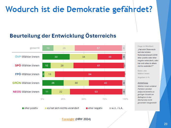 Österreichs Demokratie sei stabil, aber nicht unumstritten, so Fallend laut Umfragen: In einer Gallup-Umfrage aus 2024 haben immerhin 46 Prozent angegeben, dass die Demokratie in Österreich gefährdet sei – davon 33 Prozent mit „eher ja“ und 13 Prozent mit „ja, auf jeden Fall“. Als größte Bedrohungen wurden Korruption (62 Prozent), gefolgt von „Unkontrollierte Einwandrung“ und „Politischer Extremismus“ (jeweils 45 Prozent) angeführt. Die „Kluft zwsichen Arm und Reich“ (43 Prozent) und „Einschränkung der Meinungsfreiheit“ (40 Prozent) wurden ebenfalls als Probleme genannt. Aufschlußreich ist auch die Einschätzung der Entwicklung Österreichs – hier gibt es starke Unterscheide bei den Wähler:innen nach Parteien. Auf die Frage, ob sich seit der letzten Nationalratswahl 2019 Österreich „eher negativ“ entwickelte habe, antworteten 84 Prozent der FPÖ-Wähler:innen mit „Ja“, 63 Prozent der NEOs- und 61 Prozent der SPÖ-Wähler:innen mit „Ja“, bei den Grünen waren es nur 40 Prozent, bei der ÖVP nur 30 Prozent, was freilich auch damit zusammenhängt, dass diese beiden Parteien die Regierungsverantworttung innehatten (siehe Grafiken).