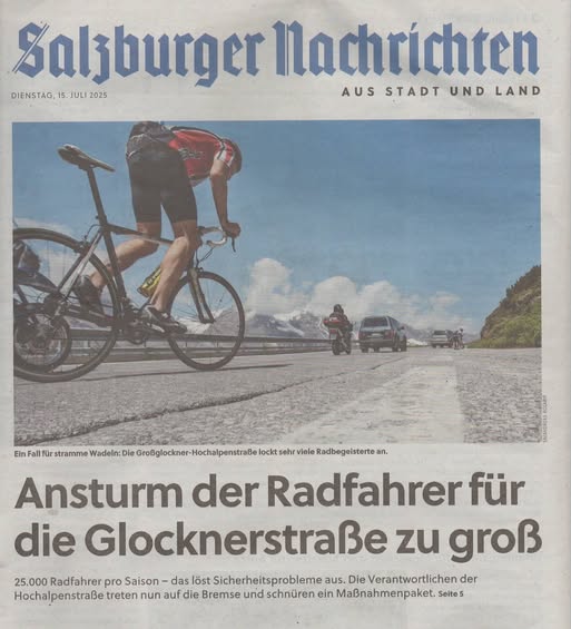 Die SN vom 15. 7.2025 berichten über die Klagen der Großglockner Hochalpenstraßen AG (Grohag) vor zu vielen Radfahrenden, die ein Sicherheitsrisiko darstellen würden. Das Ziel sei, diese an die Randzeiten zu bringen, damit tagsüber die Autos genügend Platz haben. Bei 250.0000Autos im Jahr gegen [über] 25.000 Radelnden ist zu fragen, wer das Risiko für wen darstellt. Jene, die mit dem Auto den Großglockner hochfahren, bringen dem Unternehmen Mauteinnahmen, die Radelnden (noch) nicht. Soll bei der neuen Landeshauptfrau vorgefühlt werden, ob die früher bereits gewünschten, aber aufgrund von Protesten abgesagten Pläne einer Maut auch für Radfahrende nun vielleicht doch kommen könnten? „Nein, das wollen wir verhindern, obwohl es dazu auch bei uns Gegenmeinungen gibt“, wird Grohag-Vorstand Johannes Hörl zitiert. In Zeiten der Erderhitzung scheinen Projekte wie die Großglockner Hochalpenstraße ohnedies fragwürdig, mit Treibhausgase produzierenden Automobilen den Nationalpark erkunden, ist aus der Zeit gefallen.
