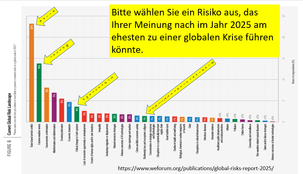 Winiwarter zitierte Erebnisse des aktuellen Global Risk Report, der jährlich beim Weltwirtschaftsgipfel in Davos vorgestellt wird. Demgemäß führen militärische Konflikte die Rangliste der von den Befragten erwarteten Risiken noch vor Extremwetterereignissen an – auch das Kippen von Ökosystemen liegt weit voran (siehe Grafik). Diese Einschätzung der globalen Risiken sei in allen Generationen ähnlich, es liege daher an der Politik, dagegen anzugehen. Abgefragt wurde auch, welche Ansätze zur Abwendung der Risiken als am wirksamsten eingeschätzt werden. An vorderster Stelle für eine Vielzahl der Risiken werden globale Vereinbarungen und Regularien genannt, so Winiwarter. Es sei daher Aufgabe der Politik, dies wahr- und ernstzunehmen und danach zu handeln