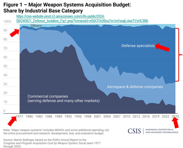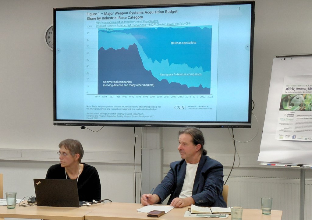 Mit dem vom ehemaligen US-Präsidenten Eisenhower 1961 geprägten Begriff des militärisch-industriellen Komplexes machte die Umwelthistorikerin die wirtschaftliche Macht dieses Sektors deutlich. Während bis herauf in die 1970er-Jahre der Großteil jener Unternehmen, die Rüstungsgüter produzierten, auch auf zivilen Märkten vertreten gewesen seien, habe sich der Rüstungssektor seither laut Erhebungen von CSIS verselbstständigt: „60 Prozent der am Rüstungsmarkt vertretenen Unternehmen produizieren heute ausschließlich Rüstungsgüter und sind daher stark von der Ausweitung dieses Sektors abhängig.“