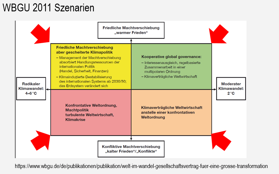 Dem Wissenschaftlichen Beirat für Globale Umweltveränderungen (WBGU) Deutschland folgend, benannte Winiwarter vier mögliche Zukunftsszenarien, von denen wir Gefahr laufen, in das gefährlichste hineinzustolpern: Das Zusammenkommen einer konfrontativen Weltordnung sowie der Ausweitung von Machtpolitik mit einer turbulenten Weltwirtschaft sowie einer Verschärfung der Klimakrise. Vom Wunschszenario einer kooperativen „Global Governance“ mit Interessensausgleich, regelbasierter Zusammenarbeit in einer multipolaren Weltwordnung sowie einer klimaverträglichen Weltordnung und Weltwirtschaft seien wir weit entfernt (s. Grafik)