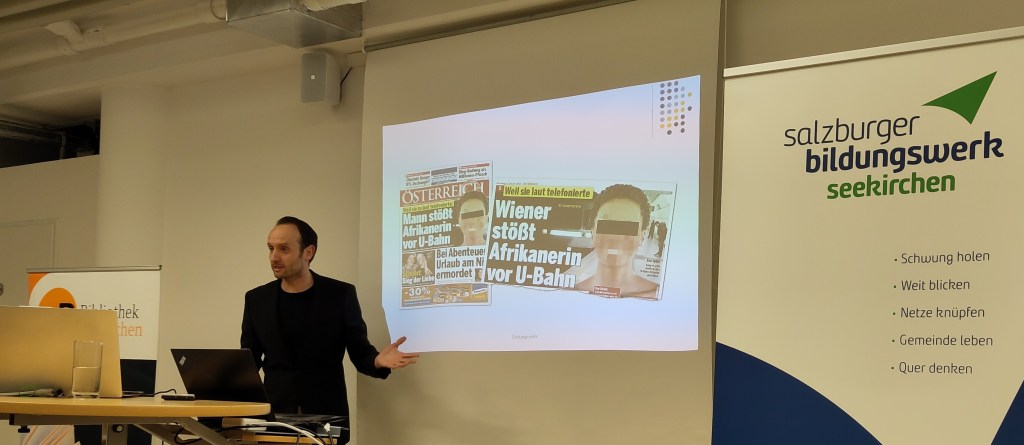 Resümee: Der Vortrag war informativ, anschaulich und auch kurzweilig aufgrund der vielen gebrachten Beispiele. Medien und ihre Nutzung sind von großer demokratiepolitischer Bedeutung – dies machte die Veranstaltung im Medienschwerpunkt des Salzburger Bildungswerks einmal mehr deutlich. Besten Dank an die Stadtbibliothek Seekirchen und die Leiterin Daniela Lukits für die Kooperation und Gastgeberschaft.