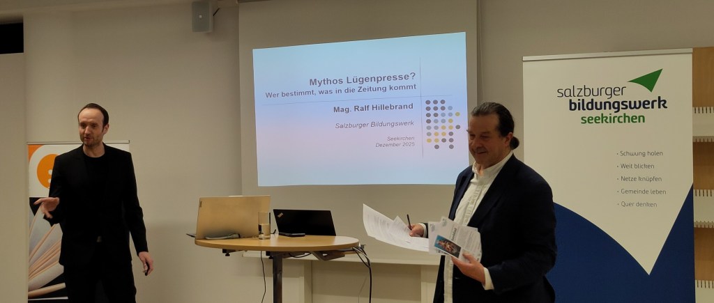 Das Interesse am Vortrag unter dem Motto „Mythos Lügenpresse“ war groß. An die 40 Interessierte waren auf Einladung des Salzburger Bildungswerks in den Veranstaltungssaal der neuen Stadtbibliothek Seekirchen gekommen. Das ist verständlich, denn die Medienlandschaft und das Mediennutzerverhalten sind im starken Umbruch. Umfragen zeigen, dass das Vertrauen in die Medien nach wie gegeben ist, aber es nimmt ab. In einer aktuellen Studie zu Österreich stimmten nur mehr 42 Prozent der Teilnehmer:innen voll oder eher zu, den meisten Medien in Österreich zu vertrauen. Allerdings sorgen sich rund zwei Drittel um den professionellen Journalismus angesichts gekürzter Budgets, sinkenden Abozahlen, dem Abbau von Arbeitsplätzen und Druck auf professionelle Journalist:innen. Eine andere Umfrage hat ergeben, dass drei Viertel der Befragten den Konsum von Nachrichten immer öfter bewusst meiden, weil sie die vielen Krisenberichte nicht mehr hören wollen. Und wie steht es um die Glaubwürdigkeit des Journalismus? Hillebrand zitierte eine IFES-Umfrage aus 2021, dergemäß 52 Prozent der Befragten meinten, Journalisten und Journalistinnen seien käuflich.