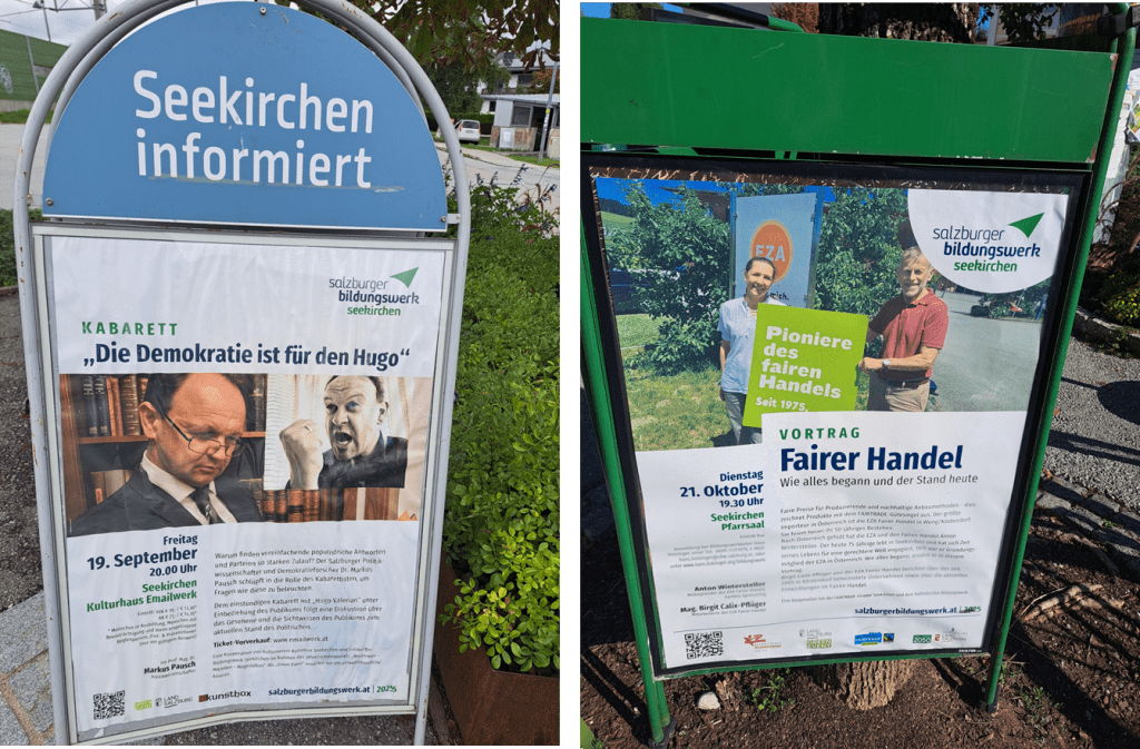 Dank geht an die Stadtgemeinde Seekirchen, die uns Plakatständer zur Verfügung stellt. Zudem werden alle Veranstaltungen in der Stadtzeitung, auf der Homepage der Stadtgemeinde sowie in den lokalen Medien angekündigt.