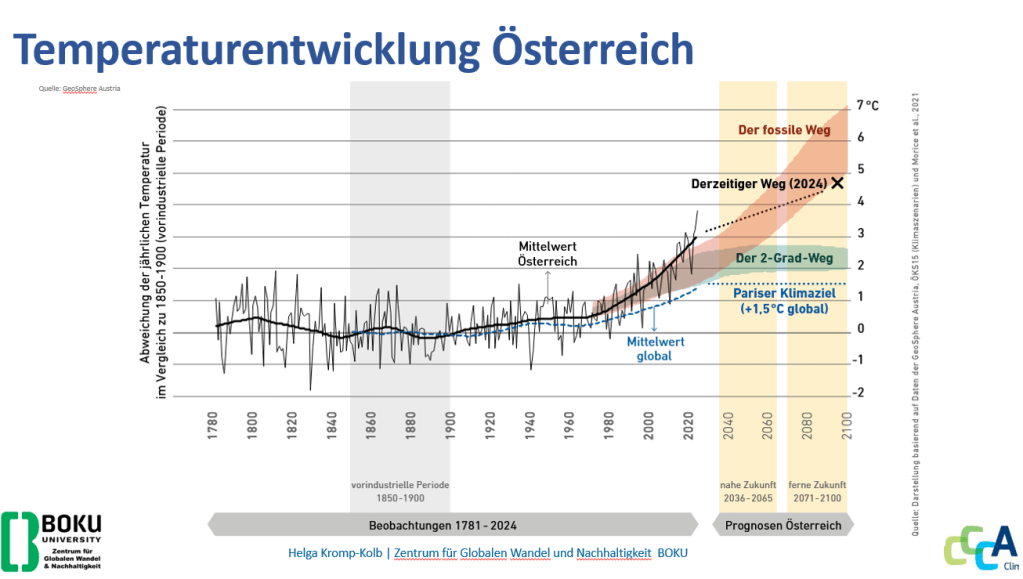 Die Phase seit dem Übergang zur Sesshaftigkeit vor etwa 12.000 Jahren war gekennzeichnet von einem überwiegend ausgeglichenen Klima, dies ändert sich seit Beginn der industriellen Zivilisation in dramatischem Tempo – dies machte Kromp-Kolb anhand einer Langzeit-Temperaturkurve deutlich. Insbesondere seit den 1980er-Jahren steigt die globale Durchschnittstemperatur rapide an. Die realen Temperaturerhöhungen würden den Klimaprognosen davonlaufen – sie entsprechen heute bereits jenen Werten, die für 2040 vorhergesagt worden seien, so Kromp-Kolb (Grafik 2).