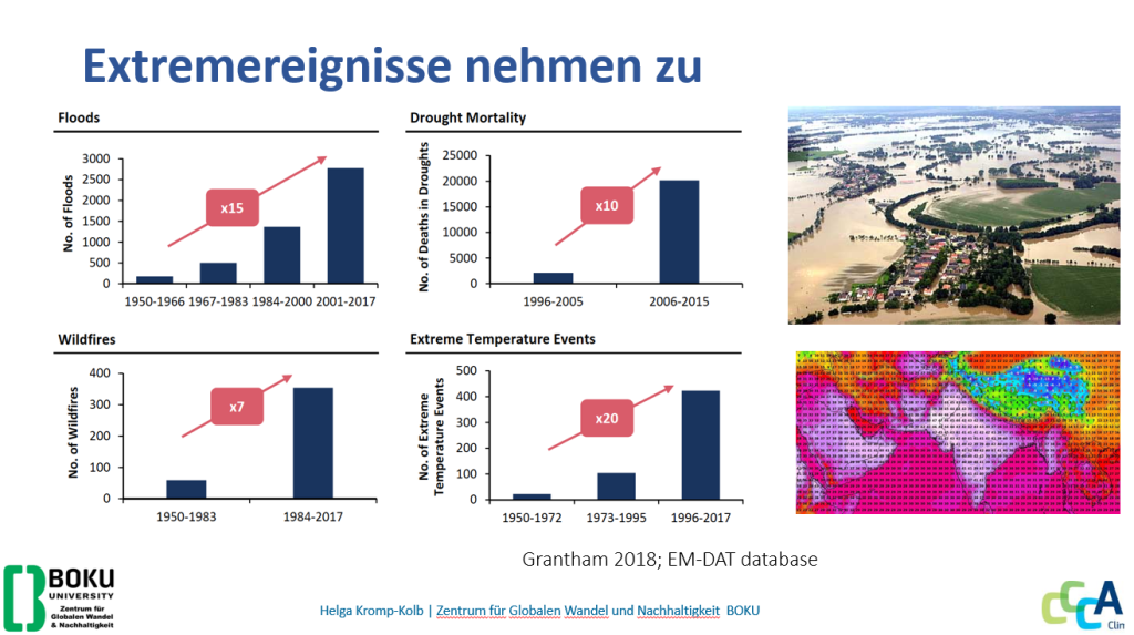 Im ersten Teil ihres Vortrags zeigte die Klimaforscherin anhand zahlreicher Daten, dass nicht nur die globale Erwärmung insbesondere seit den 1980er-Jahren stark zugenommen hat, sondern auch die Zahl der Extremereignisse wie Überschwemmungen, Waldbrände, Hitzetage sowie – als eine Folge – die Zahl der Toten aufgrund von Dürren (siehe Grafik 1). Phänomene wie der Rückgang der Eismassen an den Polen, die Erwärmung und Versauerung der Meere oder der Verlust an Biodiversität würden die Komplexität zeigen, die mit der Erderwärmung zusammenhängt. Starke Klimaveränderungen habe es in der Geschichte des Planeten immer wieder gegeben, doch mit dem Unterschied, dass damals noch keine Menschen auf der Erde waren.