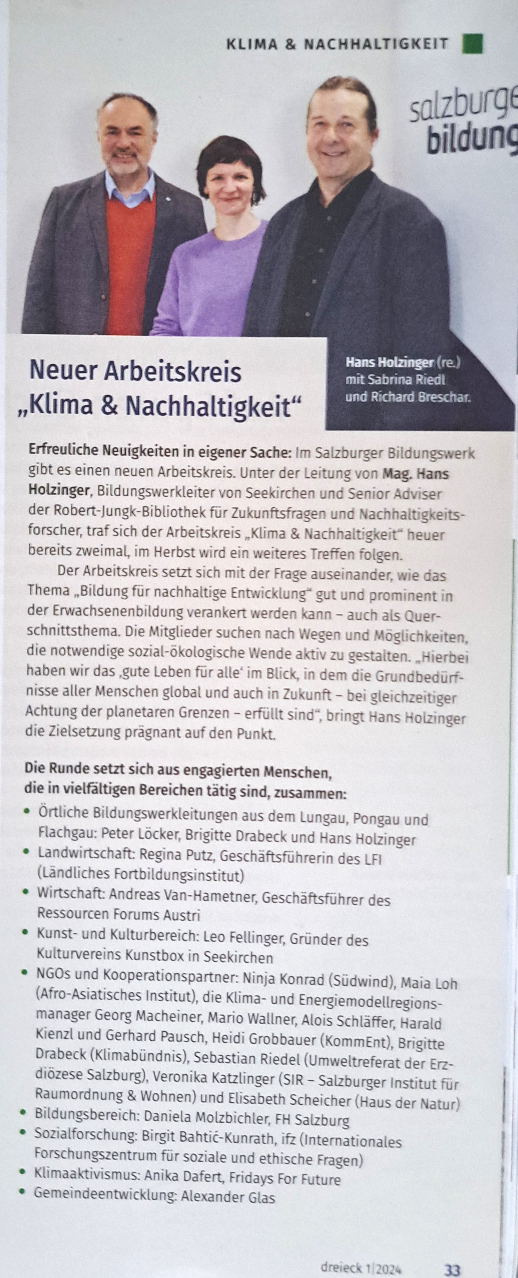 Der Arbeitskreis Klima & Nachhaltigkeit des Salzburger Bildungswerks versteht sich als Reflexions- und Vernetzungsraum für Menschen und Organisationen, die im Bereich Klima- und Nachhaltigkeitsbildung aktiv sind. mehr Die Treffen finden 2 Mal im Jahr statt. Ein Projekt sind die Aktionstage „Aufbruch für ein gutes Leben für alle“, die 2026 vom 22.-26. April stattfinden werden. Zudem werden weitere Veranstaltungen mit Öffentlichkeitscharakter organisiert.