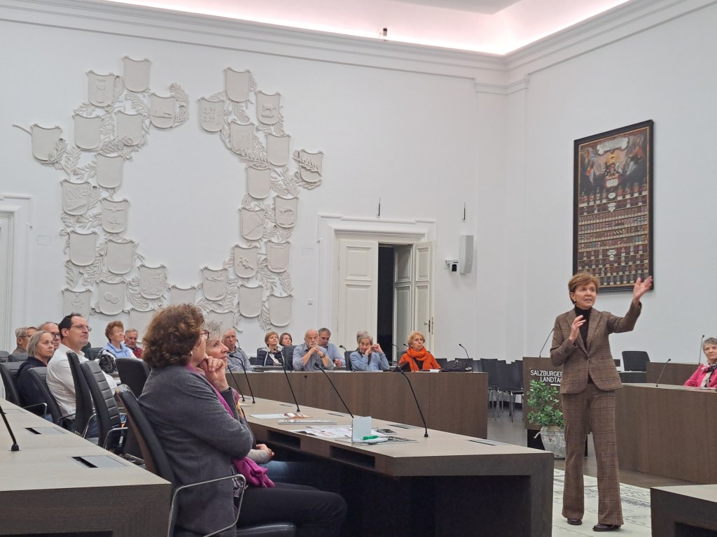 An die 70 Interessierte aus fünf Salzburger Bildungswerken, darunter auch Seekirchen, waren der Einladung in den Salzburger Landtag am 11. November 2025 gefolgt. Landtagspräsidentin Dr.in Brigitta Pallauf informierte über die bewegte Geschichte des Hauses: Der Chiemsee war ab 1300 Sitz des Bischofs von Chiemsee, ab 1817, nachdem Salzburg von Bayern zu Österreich kam, Sitz des Salzburger Erzbischofs, der einen Fluchtgang zur Festung besaß. 1862 wurde der Chiemseehhof dem Land Salzburg übergeben und zum Sitz des Salzburger Landtags, der damals aus Vertretern der umliegenden Städte bestand, wie zwei Gemälde im heutigen Saal zeigen. Unter den Abgeordneten war immer eine Frau, so Pallauf, die Vorsteherin des Klosters Nonntal. Die erste Sitzung im neu errichteten und bis heute genutzten Sitzungssaal des Landtags fand 1868 statt.